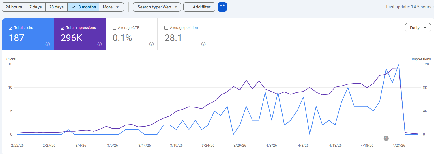 - Google Search Console: 296k impressions, 187 clicks lifetime