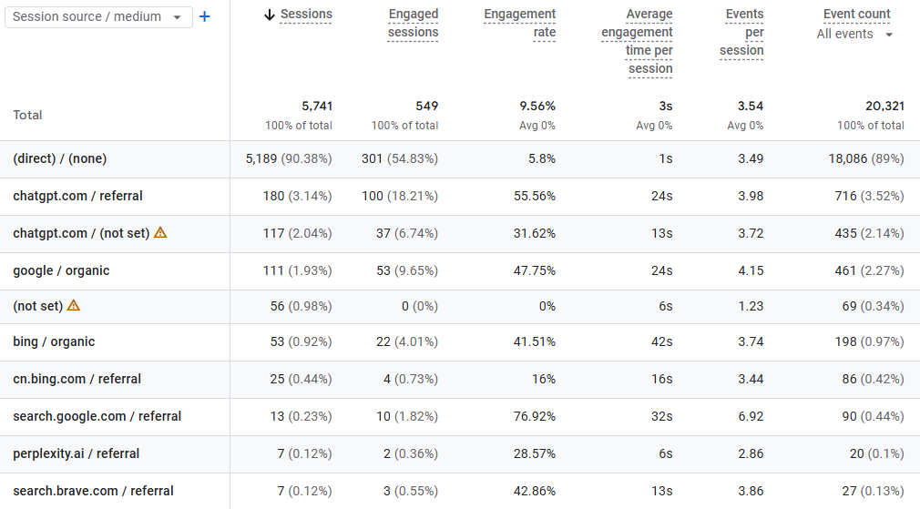 The above stats show the last 30 days of Google Analytics. Direct traffic is obviously garbage - scrapers, AI agents, bots - zero engagement, but other than Google, not much has changed. It wasn't the only source of traffic.