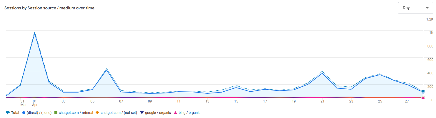 Then I looked at Google Analytics. ChatGPT referrals are showing up. Not a flood, but they're there. Direct traffic, which is increasingly where AI-assistant traffic hides, didn't stop.
