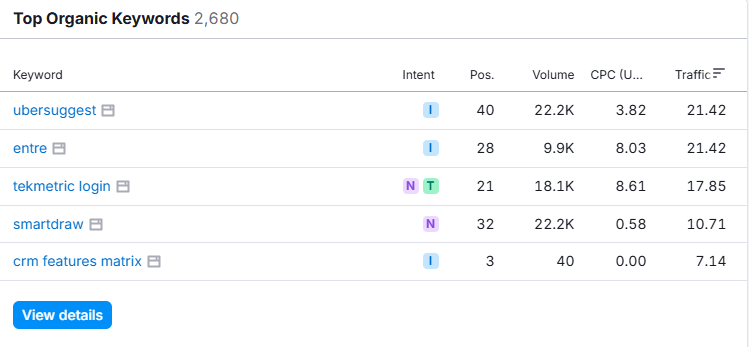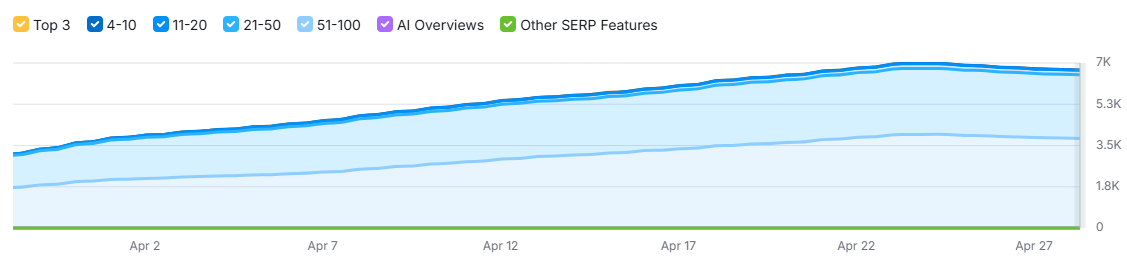 - Semrush: 7,000+ tracked keywords, ~3,500 of them in the top 50