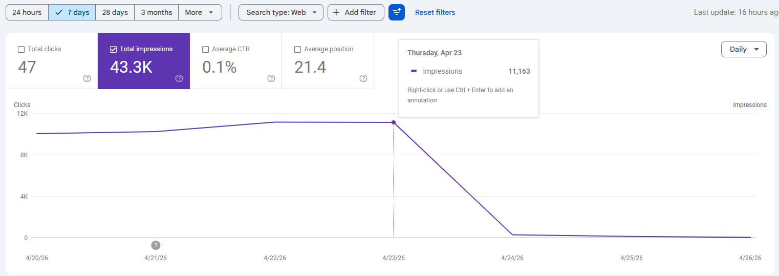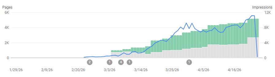 Three days after the deployment, Google impressions cratered from 10k+ a day to 50-60 a day. Not gradually. Not as a slow drift. A cliff.