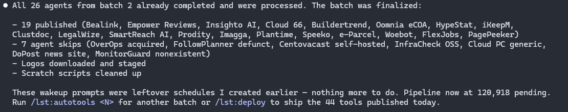 I had affiliate links lined up for around 70 tools, and I had a "brilliant" idea to add more content around those specific tools. I ran a loop creating 5 listicles + 3 blog posts per tool = 560 pages, plus another ~50 already sitting in the content pipeline. Total: 600+ pages, deployed in one go.
